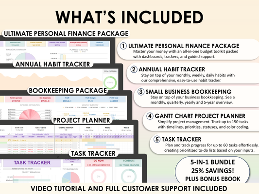 The Ultimate Bundle - Ultimate Personal Finance Package + Annual Habit Tracker + Small Business Bookkeeping Package + Gantt Chart Project Planner + Task Tracker for Excel & Google Sheets