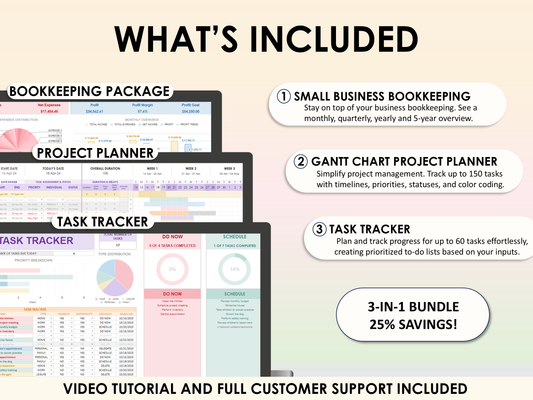 Small Business Starter Bundle - Small Business Bookkeeping Package + Gantt Chart Project Planner + Task Tracker for Excel & Google Sheets